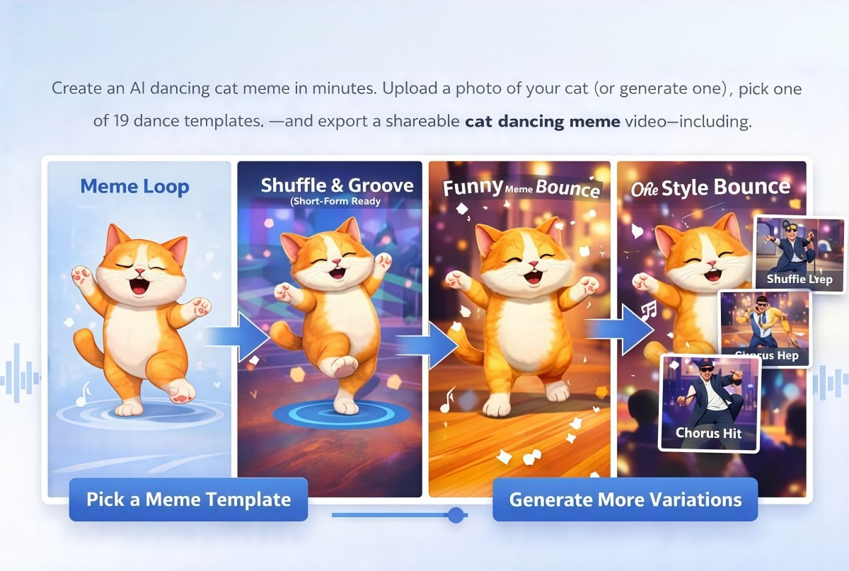 Switch templates to change the vibe instantly—cute bounces, silly wiggles, or a steadier groove that feels “music video” clean. This is perfect for pet accounts and creators who like testing formats: same dog, different choreography, different hook. For best results, use a crisp silhouette (fur edges matter), avoid tiny subjects in the frame, and keep paws visible when possible.