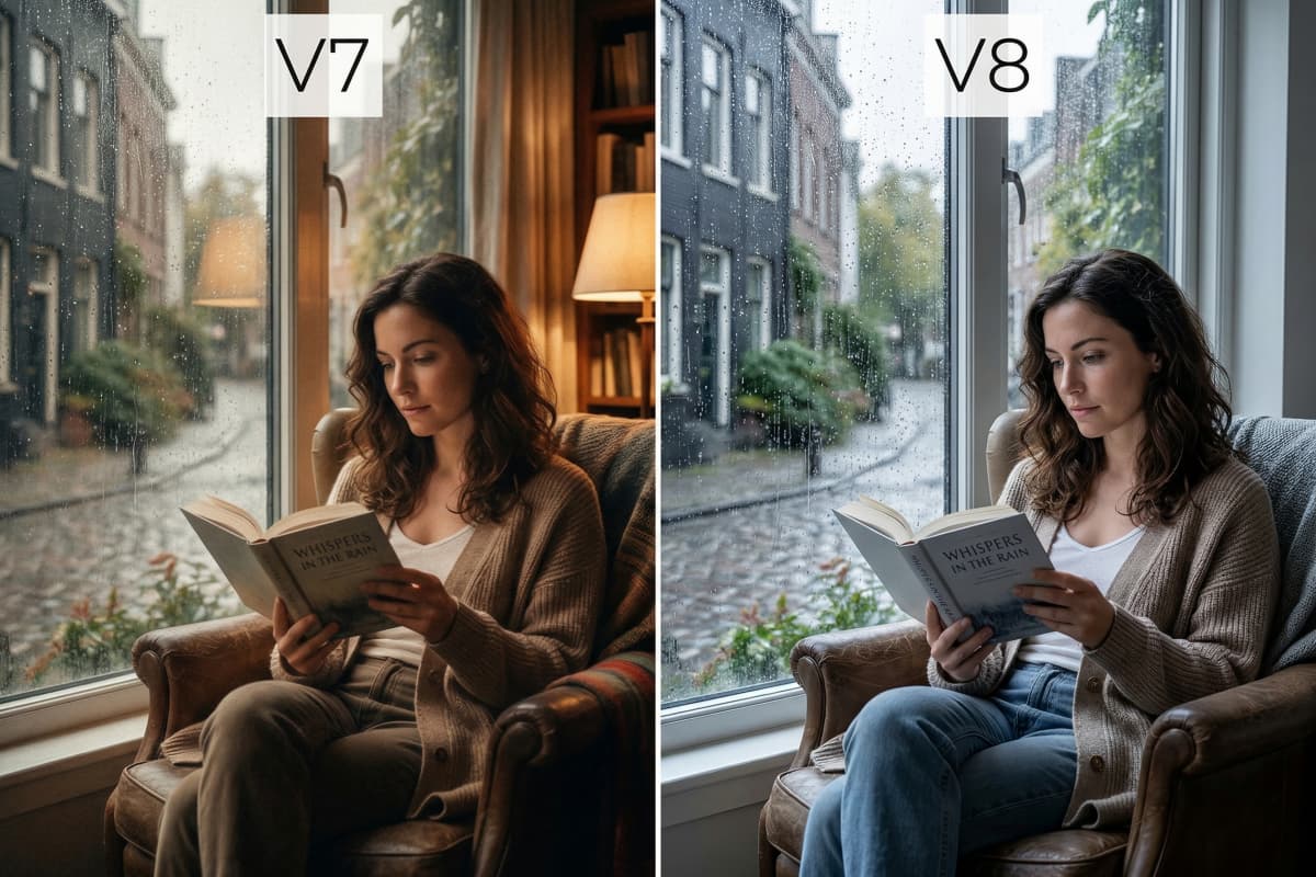 V7 has a personality. Warm colors, soft atmospheric light, a slight texture that makes even "photorealistic" outputs feel like they were shot by someone with a deliberate eye. I ran "a woman reading by a rainy window" in both versions. V7 came back with something that felt like a film still — muted greens, golden interior light bleeding in at the edges. I would have posted it as-is. V8 gave me an accurate, well-lit photograph of the same scene. Technically better in every measurable way. Harder to feel anything about.