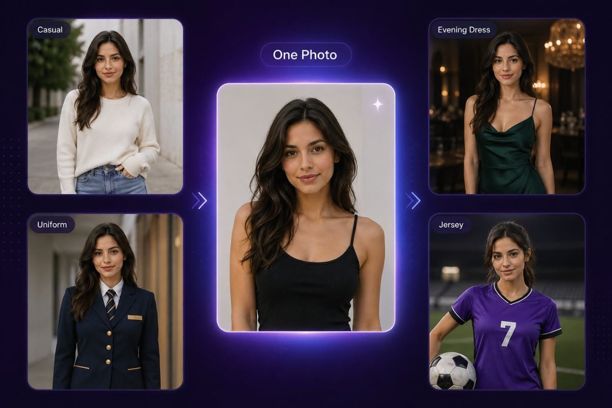 Verwandeln Sie ein Porträt in mehrere Outfit-Ideen, ohne das gleiche Shooting zu wiederholen. Nutzen Sie verschiedene Zielkleidungsbilder, um lässige Looks, Abendkleider, Uniformen, Sporttrikots und saisonale Stile zu erstellen. Dies gibt Ihnen mehr Inhaltsoptionen aus einem einzigen Foto und macht Outfit-Tests schneller, sauberer und einfacher zu vergleichen.