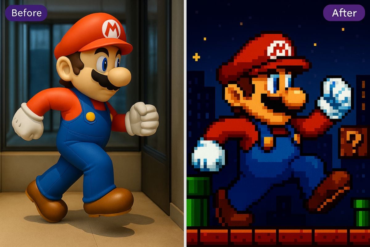 El proceso preserva los elementos compositivos clave mientras adopta la estética distintiva y cuadriculada de los juegos clásicos. Es una solución ideal para crear sprites de personajes o tiles de entorno que mantengan una coherencia estilística.