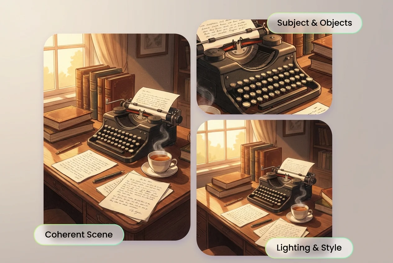 When a scene includes multiple elements—props, materials, lighting cues, and a specific mood—Grok Image helps keep the pieces from fighting each other. A useful pattern is to group details into two blocks: “What it is” (subject/objects) and “How it looks” (light/camera/style). You’ll spend less time correcting odd swaps and more time choosing the best version.