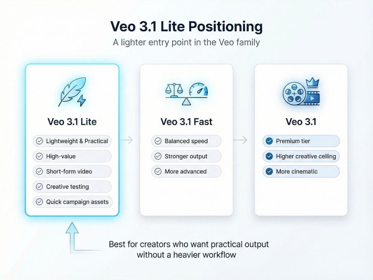 Il principale fascino di Veo 3.1 Lite non è un posizionamento appariscente. È che ti offre un percorso più economico nella famiglia Veo 3.1 più ampia quando il tuo lavoro è creare clip social, test creativi, annunci rapidi o semplici spiegazioni visive. Se vuoi verificare direttamente il background del modello, la pagina di anteprima ufficiale di Veo 3.1 Lite di Google è il punto di partenza più affidabile.