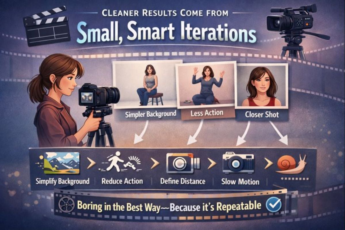 ほとんどの「良いテイク」は、1つの変数を一度に絞り込むことで得られます: 背景を簡素化し、動作の複雑さを減らし、カメラ距離を定義し、または動きを遅くすることを指定します。このアプローチは最良の意味で退屈です—それは繰り返し可能だからです。