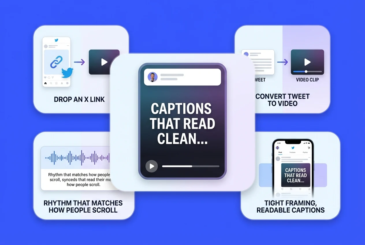 X(트위터) 링크를 드롭하고 게시물을 명확하게 보여주는 짧은 클립을 얻으세요—타이트한 프레이밍, 읽기 쉬운 캡션, 사람들이 스크롤하는 방식에 맞는 리듬. 이전에 '트윗을 비디오로' 워크플로를 시도해본 적이 있다면, 이 도구는 슬라이드쇼보다는 실제 소셜 비디오에 더 가깝게 느껴질 것입니다.