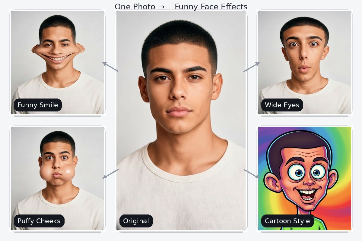 Turn one selfie into a stack of shareable results—warp, squish, big-eyes, and more. Fast setup, clean output, zero hassle.