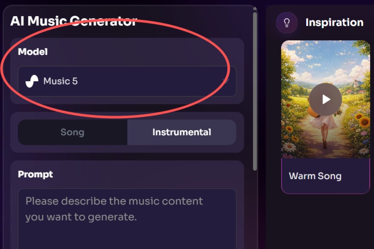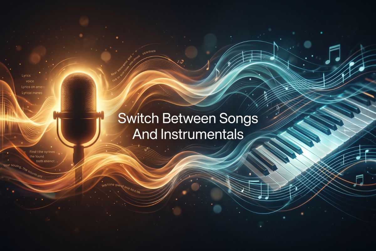Nem todo projeto precisa do mesmo formato. Escolha Música quando quiser uma direção vocal mais completa ou selecione Instrumental quando precisar de música de fundo, faixas de humor ou áudio limpo para edição. Também funciona bem como um gerador de música com IA com vocais ao adicionar suas próprias letras.