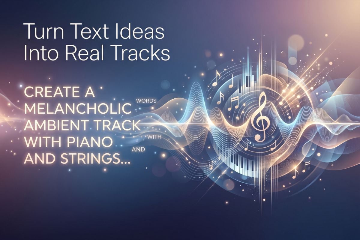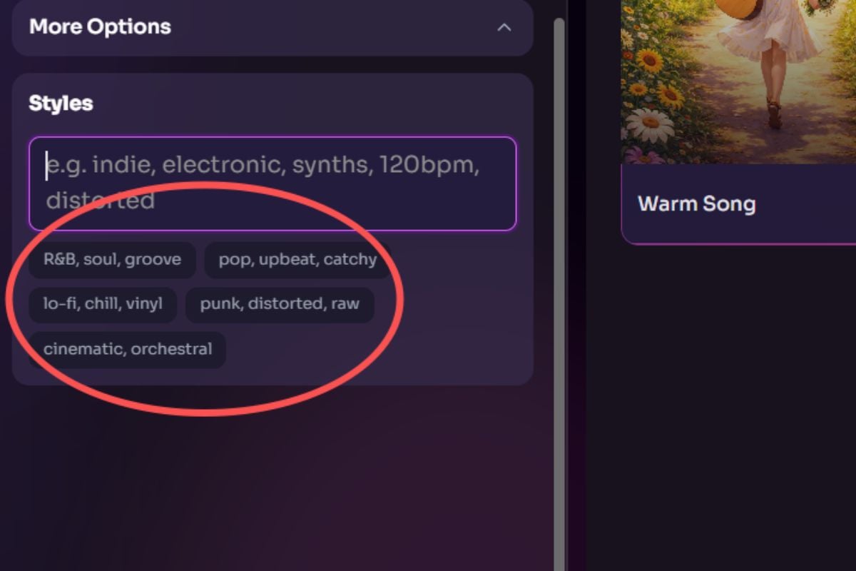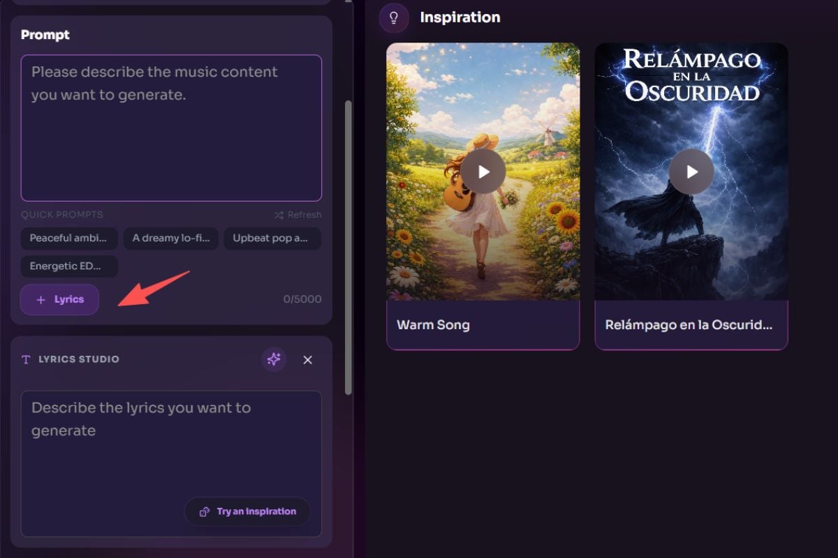 Use palavras simples de estilo como indie, cinematográfico, lo-fi, synth, brilhante, escuro, 120 BPM ou distorcido para direcionar o resultado. Isso facilita testar várias direções rapidamente para vídeos, introduções, conteúdo de formato curto ou ideias de demonstração.