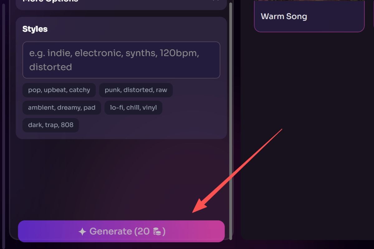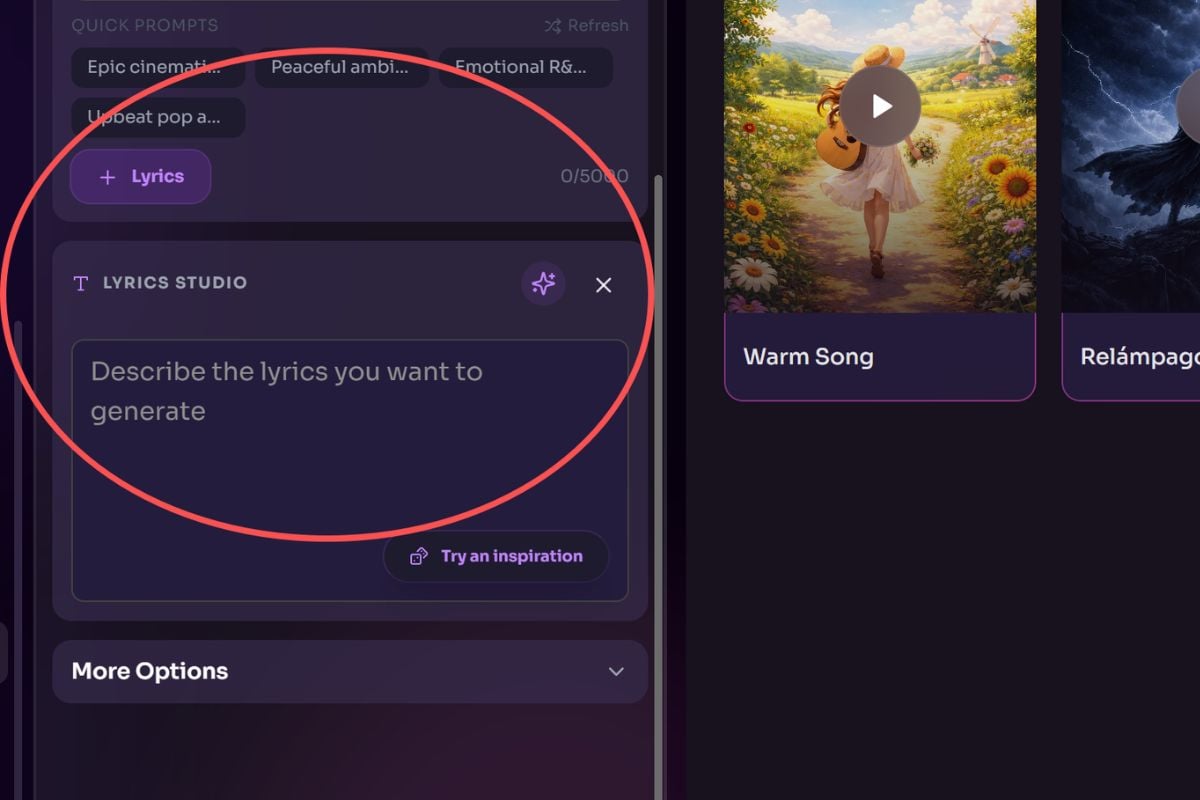 將您的歌詞、詩句、信息或粗略的想法帶入 GoEnhance AI,聽聽它如何變成音樂。創建第一個草稿,探索不同的風格,並將您的文字塑造成更接近您原始情感的歌曲。