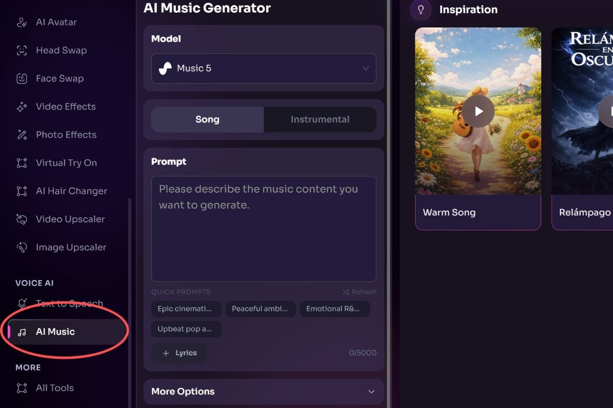 並非每段歌詞都需要相同的聲音。GoEnhance AI 提供不同的音樂模型供您探索,讓您測試不同的聲音、情感、結構和製作風格。試試表現力強的 MiniMax Music 2.6,或使用 Suno V5.5 創作更強調人聲的曲目。