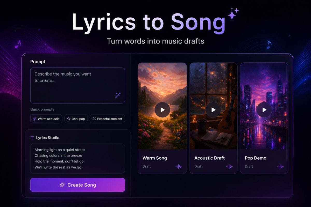從您的歌詞、詩句、片段或粗略的想法開始,將其轉換為帶有人聲、旋律、節奏、伴奏音樂和編曲的完整歌曲草稿。AI 音樂生成器 幫助您從紙上的文字轉變為可聆聽的曲目,讓您快速了解您的歌詞是否適合作為一首真正的歌曲。