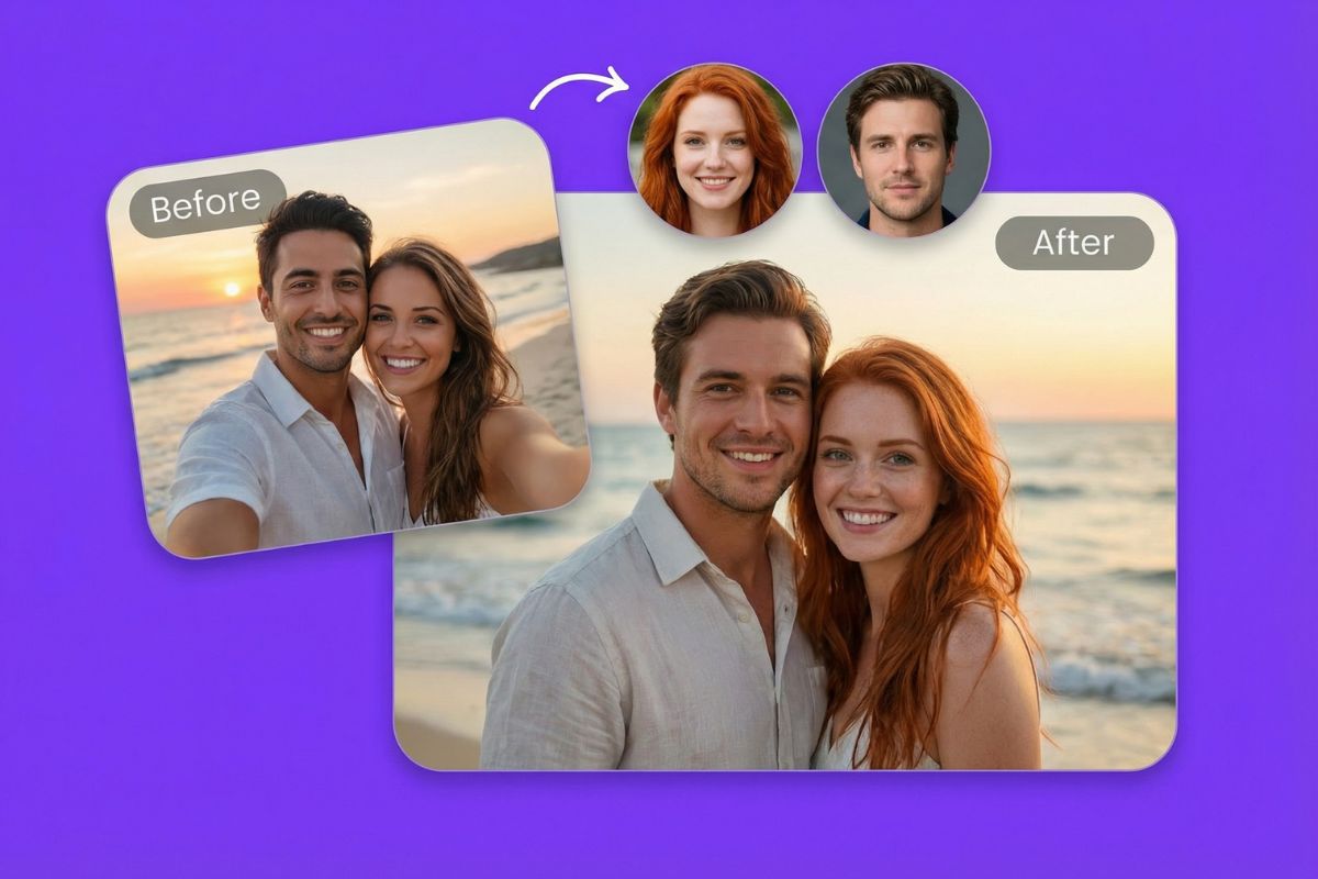 上傳團體照片或短片,選取想替換的臉部,並產生乾淨的結果。這是為日常使用而設計:團體自拍、團隊合照、派對影片,以及一臉換臉工具感覺太有限的快速剪輯。